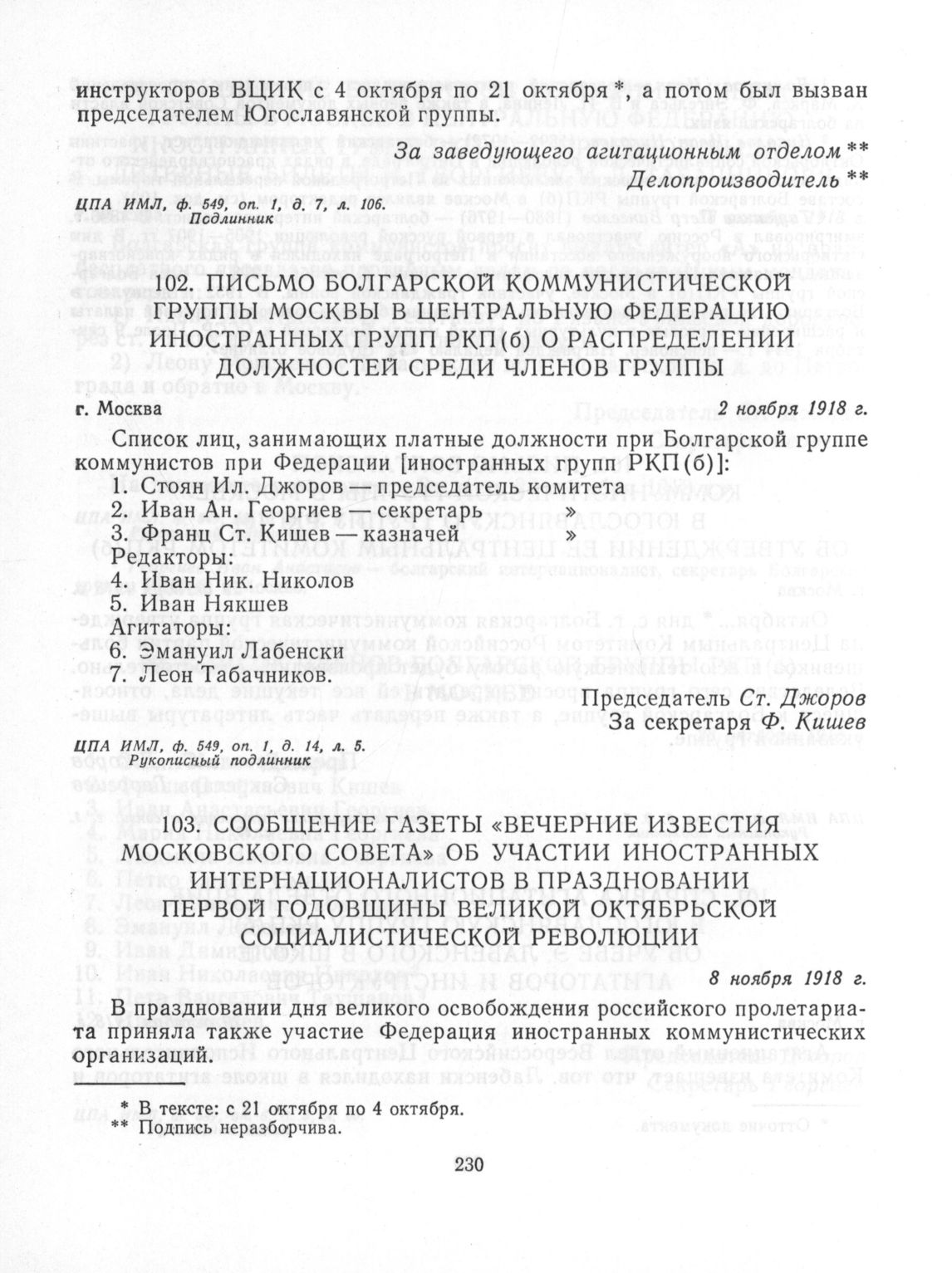 Письмо Болгарской коммунистической группы Москвы в Центральную федерацию иностранных групп РКП(б) о распределении должностей среди членов группы. 2 ноября 1918 г. // ЦПА ИМЛ, ф. 549, оп. 1, д. 14, л. 5. Рукописный подлинник.