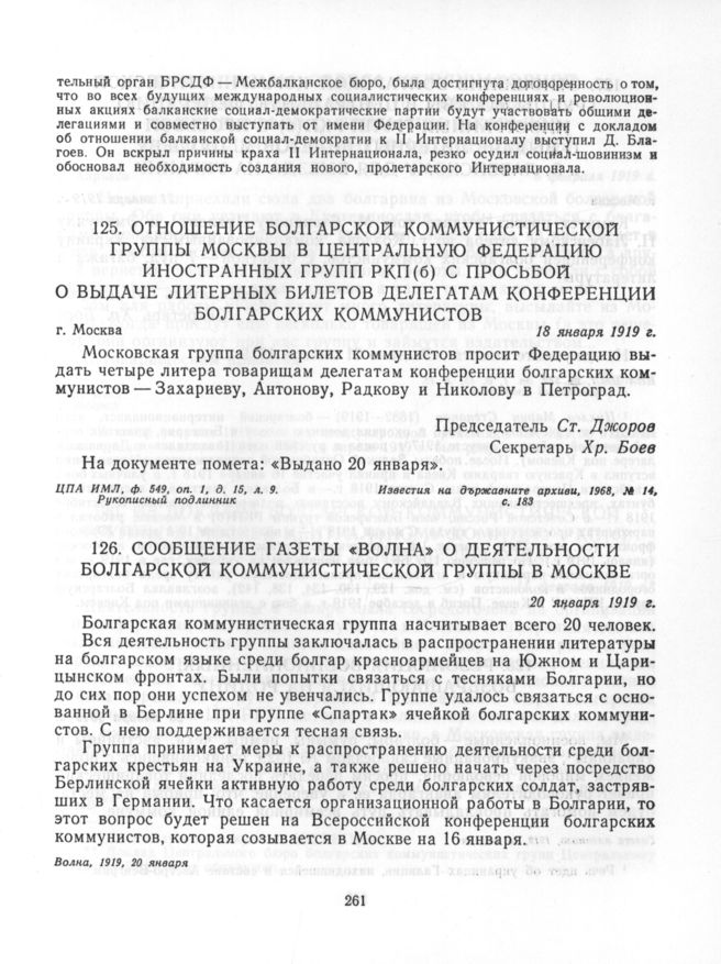 Отношение Болгарской коммунистической группы Москвы в Центральную федерацию иностранных групп РКП(б) с просьбой о выдаче литерных билетов делегатам конференции болгарских коммунистов. 18 января 1919 г. // ЦПА ИМЛ, ф. 549, оп. 1, д. 15, л. 9. Рукописный подлинник. Известия на държавните архиви, 1968, № 14, с. 183.