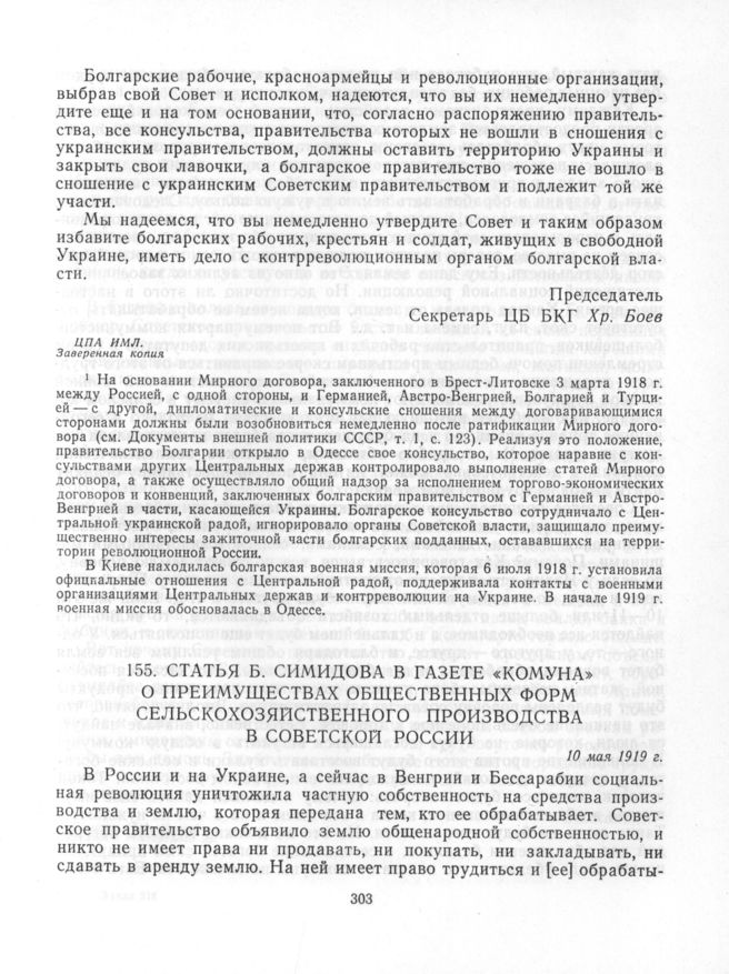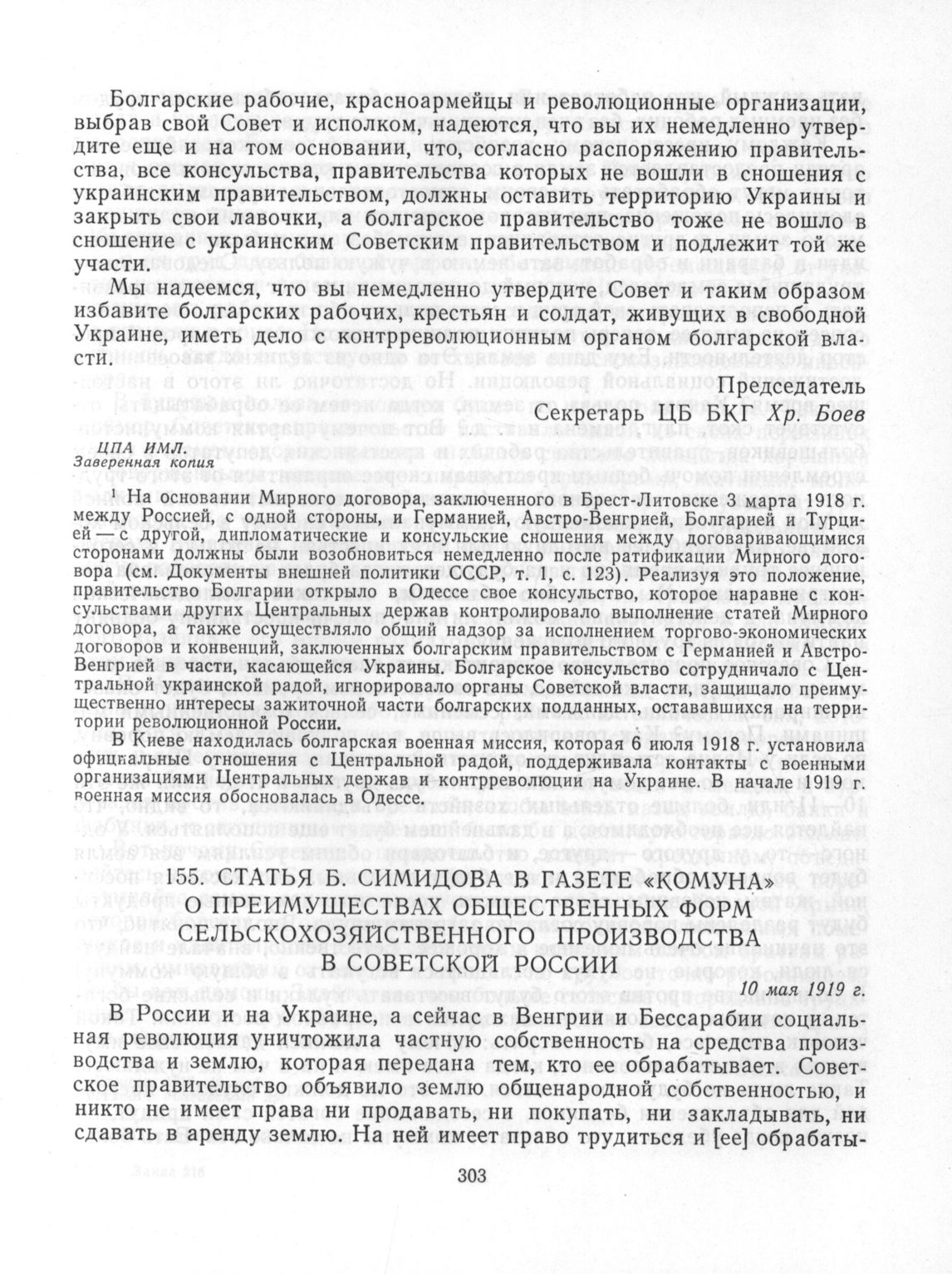 Статья Б. Симидова в газете «Комуна» о преимуществах общественных форм сельскохозяйственного производства в Советской России. 10 мая 1919 г. // Комуна, 1919, 10 май. Перевод с болгарского яз.