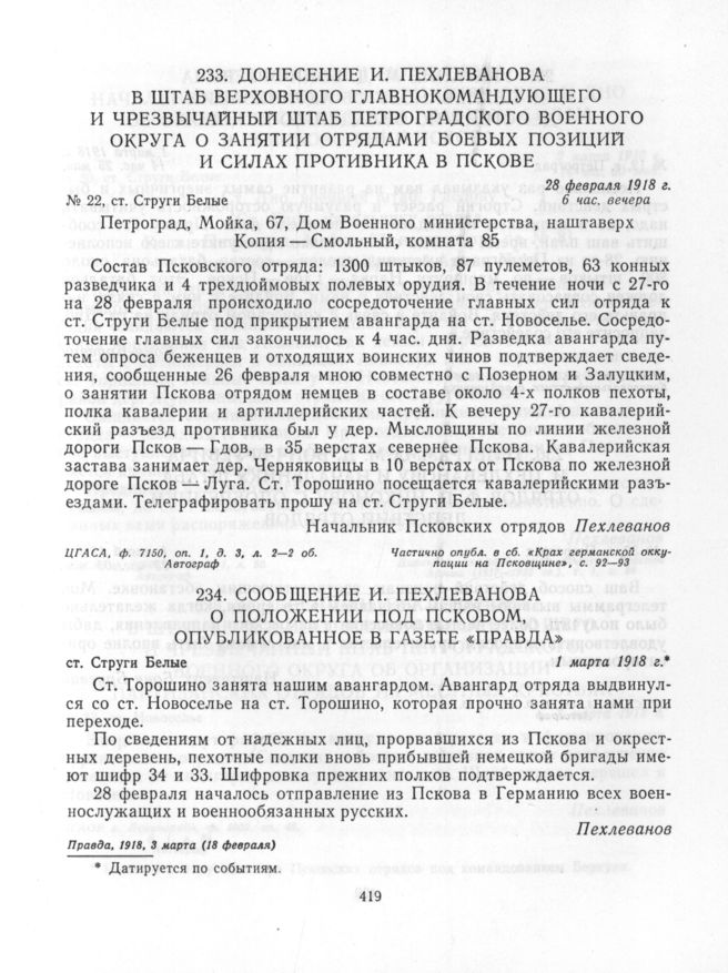 Сообщение И. Пехлеванова о положении под Псковом, опубликованное в газете «Правда». 1 марта 1918 г. // Правда, 1918, 3 марта (18 февраля).