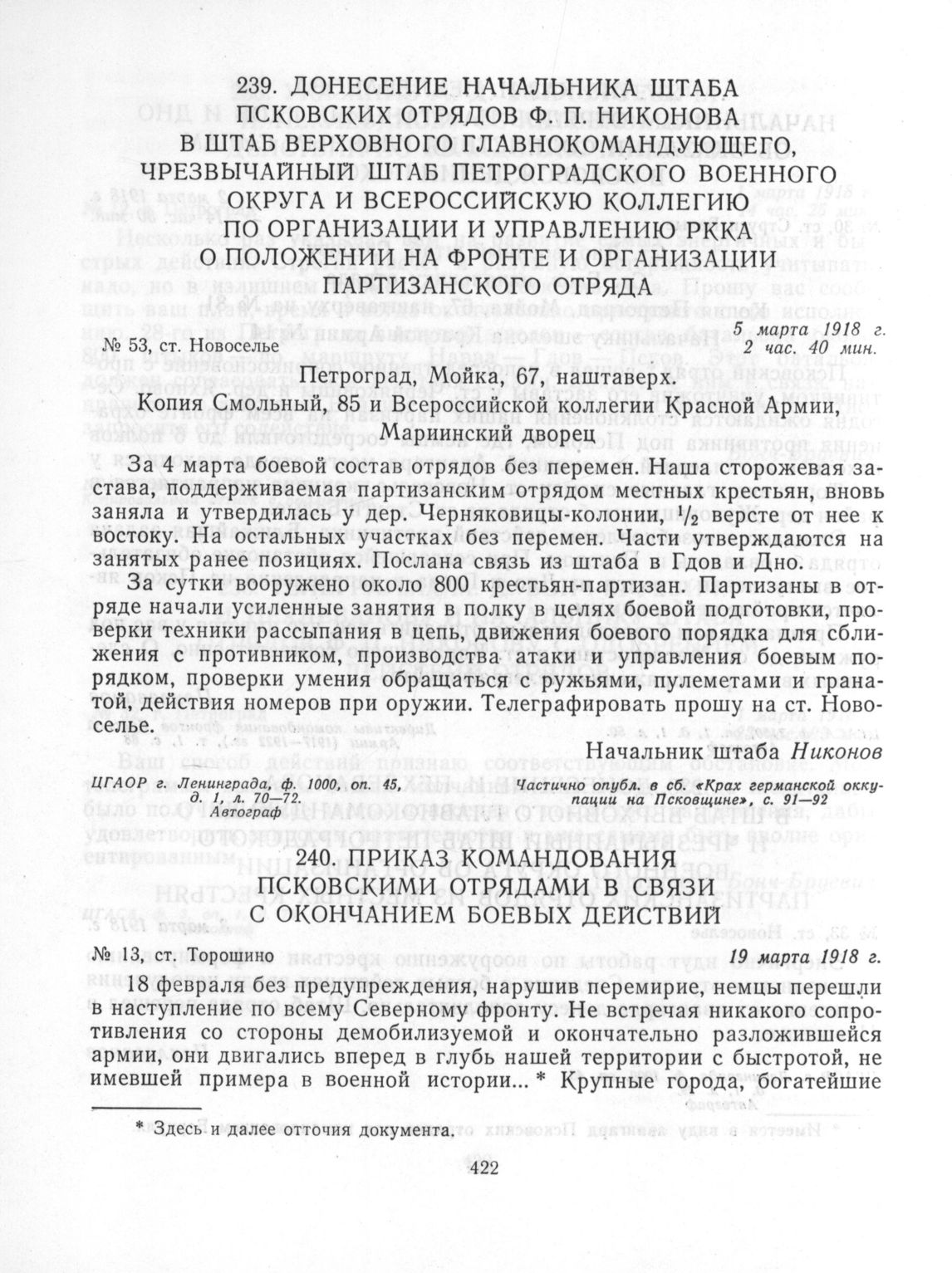 Приказ командования Псковскими отрядами в связи с окончанием боевых действий. 19 марта 1918 г. // ЦГАСА, ф. 7150, оп. 1, д. 8, л. 10-11. Заверенная копия. Директивы командования фронтов Красной Армии (1917-1922 гг.), т. 1, с. 105-107.