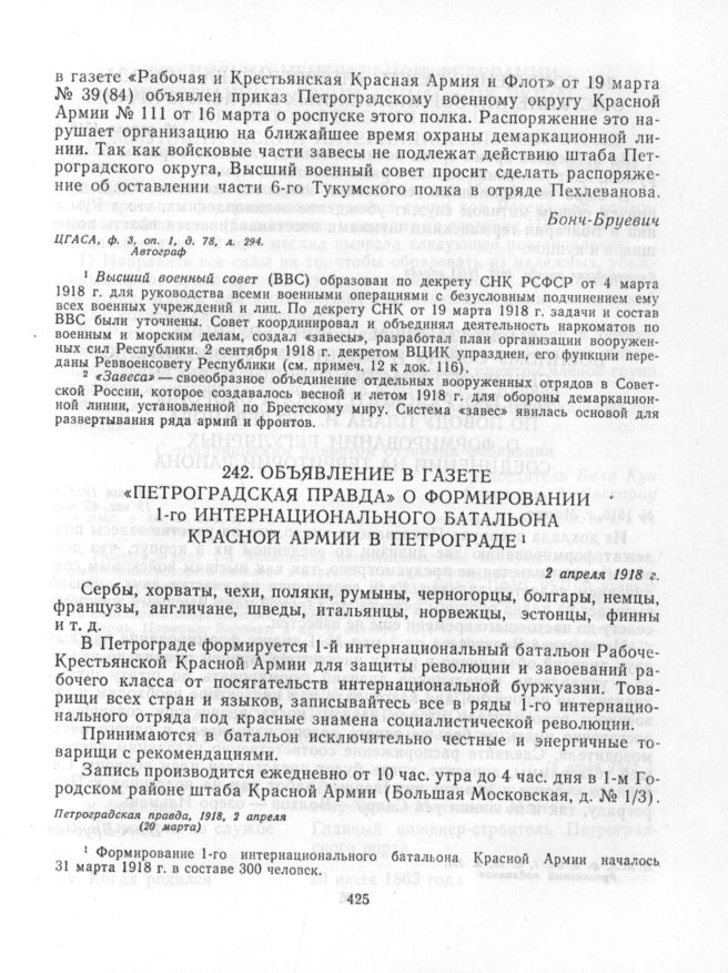 Объявление в газете «Петроградская правда» о формировании 1-го интернационального батальона Красной Армии в Петрограде. 2 апреля 1918 г.