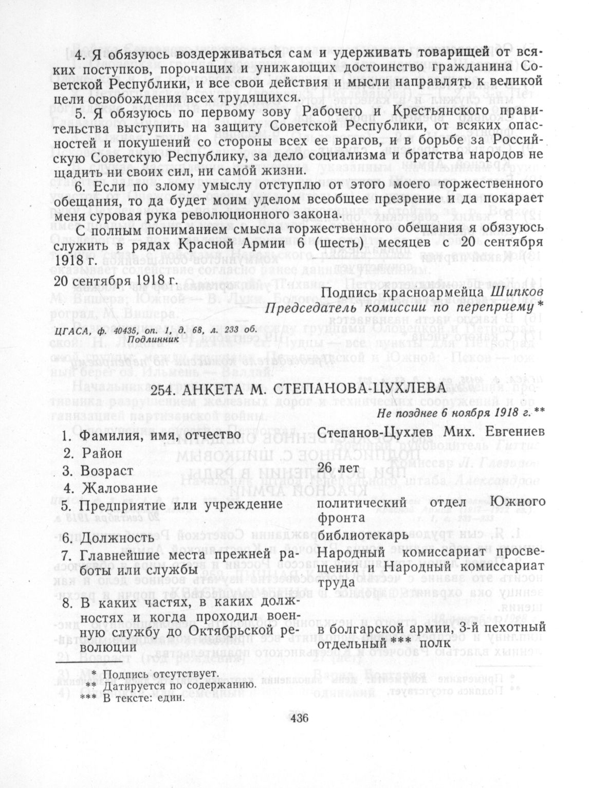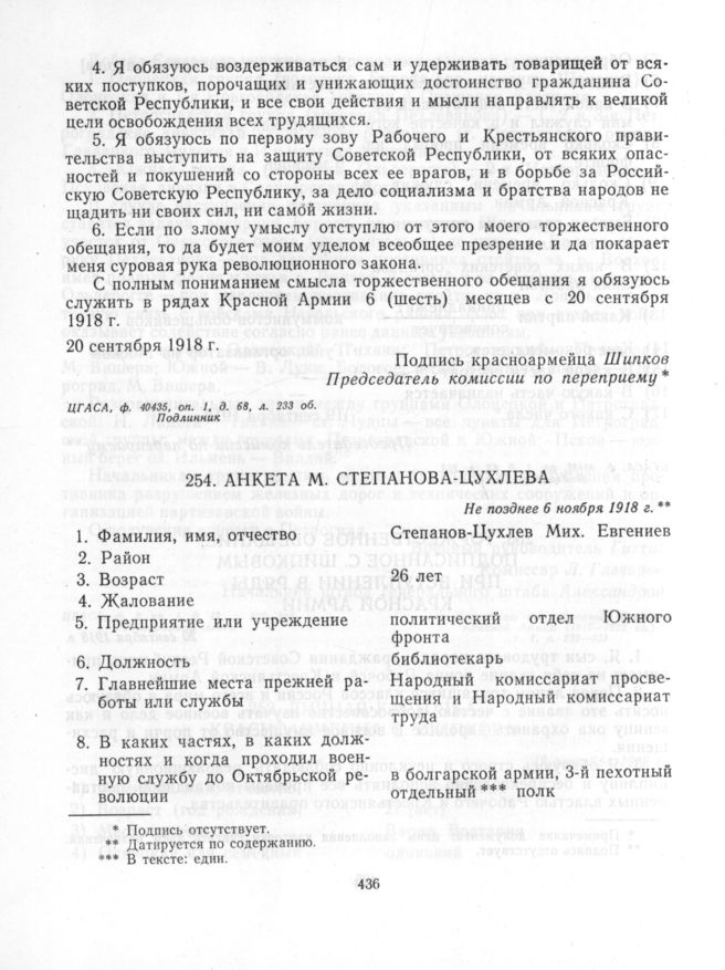 Анкета М. Степанова-Цухлева. Не позднее 6 ноября 1918 г. // ЦГАСА. л/д. № 132-592, л. 1-1 об. Подлинник.
