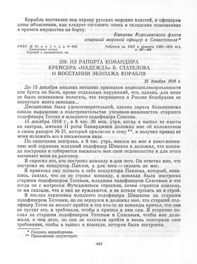 Из рапорта командира крейсера «Надежда» Б. Стателова о восстании экипажа корабля. 25 декабря 1918 г. // АМВР, ф. 65, а. е. 1, т. 1, л. 13 об.- 16 об. Подлинник. Перевод с болгарского яз. Работата на БКП в армията (1891-1918 гг.), с. 490-492.