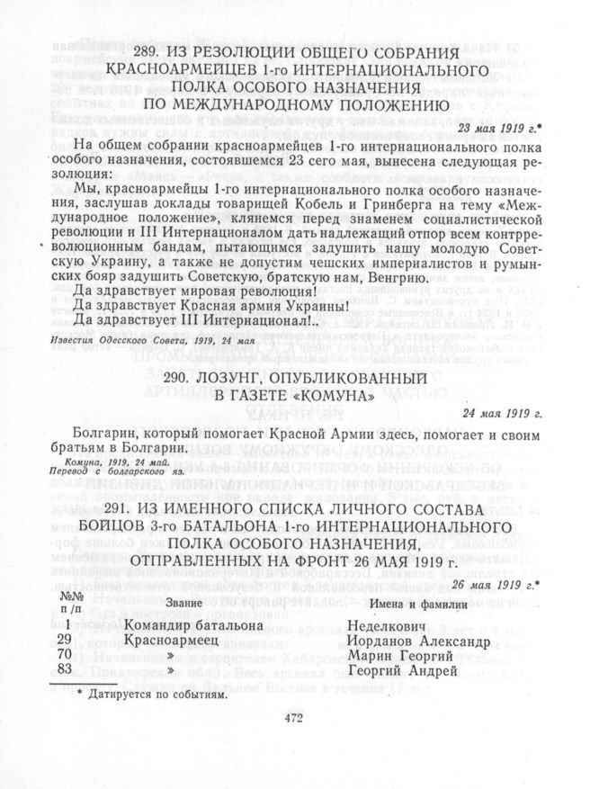 Под знаменем Октября: Сб. док. и материалов в 2 т. 25 октября (7 ноября) 1917 г.-7 ноября 1923 г. Т. I. Участие болгарских интернационалистов в Великой Октябрьской социалистической революции и защите ее завоеваний. — М.: Политиздат; София: Изд-во БКП, 1980.