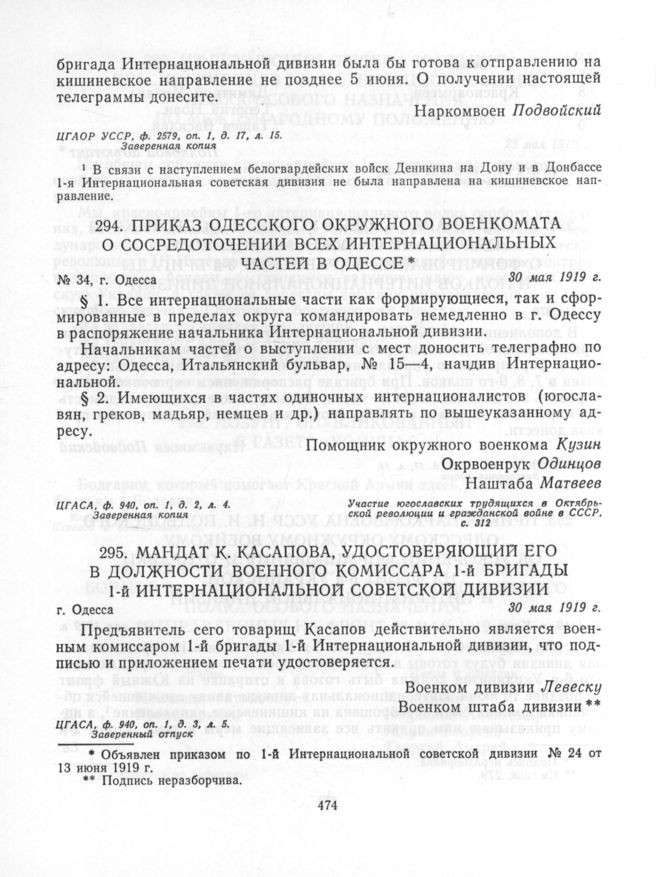 Мандат К. Касапова, удостоверяющий его в должности военного комиссара 1-й бригады 1-й Интернациональной советской дивизии. 30 мая 1919 г. // ЦГАСА, ф. 940, оп. 1, д. 3, л. 5. Заверенный отпуск.