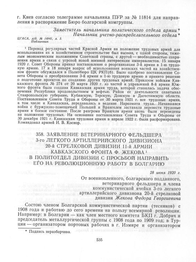Заявление ветеринарного фельдшера 3-го легкого артиллерийского дивизиона 20-й стрелковой дивизии 11-й армии Кавказского фронта Ф. Жекова в политотдел дивизии с просьбой направить его на революционную работу в Болгарию. 28 июня 1920 г. // ЦГАСА, ф. 109, оп. 4, д. 75, л. 329-329 об. Автограф.
