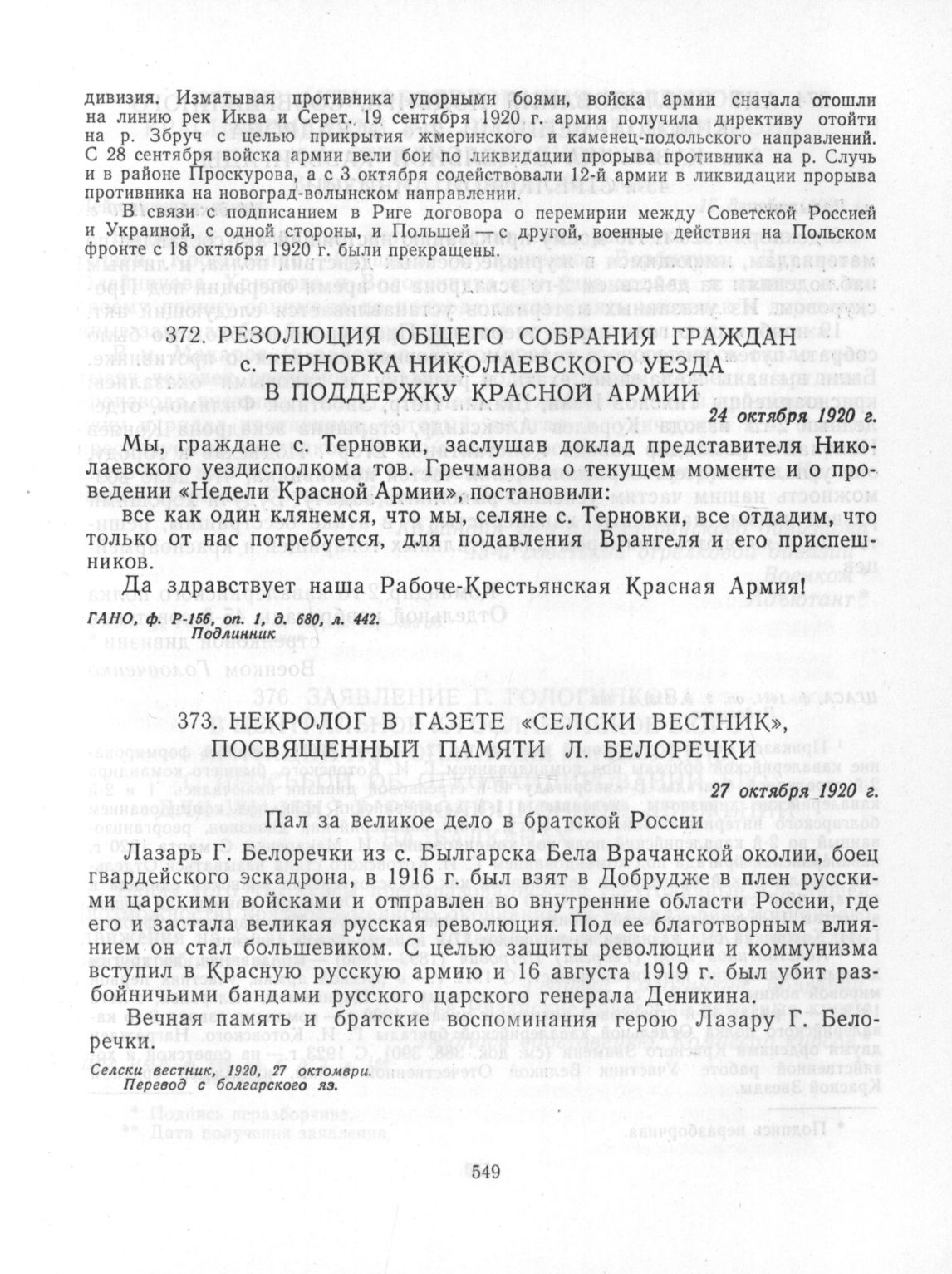 Под знаменем Октября: Сб. док. и материалов в 2 т. 25 октября (7 ноября) 1917 г.-7 ноября 1923 г. Т. I. Участие болгарских интернационалистов в Великой Октябрьской социалистической революции и защите ее завоеваний. — М.: Политиздат; София: Изд-во БКП, 1980.