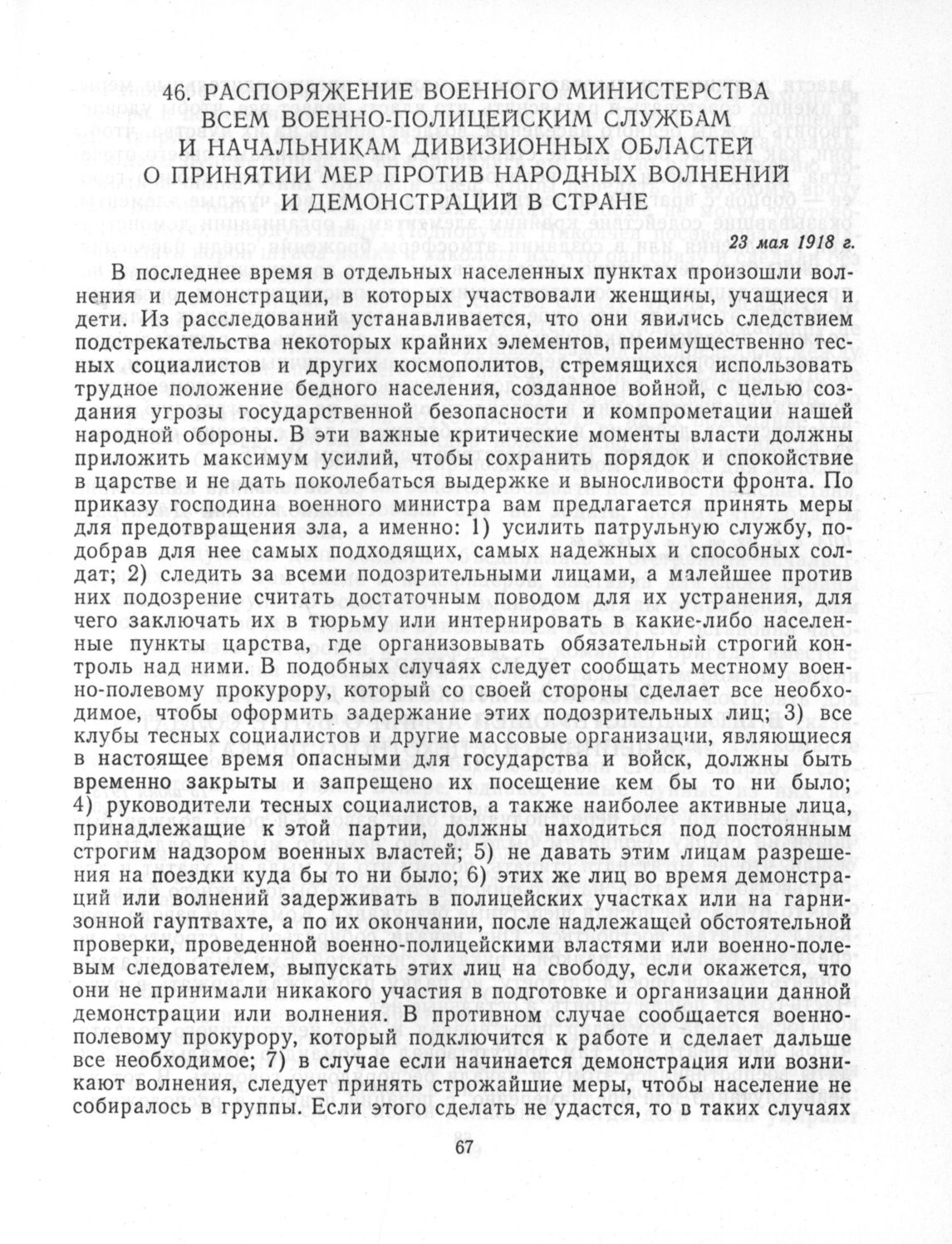 Распоряжение Военного министерства всем военно-полицейским службам и начальникам дивизионных областей о принятии мер против народных волнений и демонстраций в стране. 23 мая 1918 г.