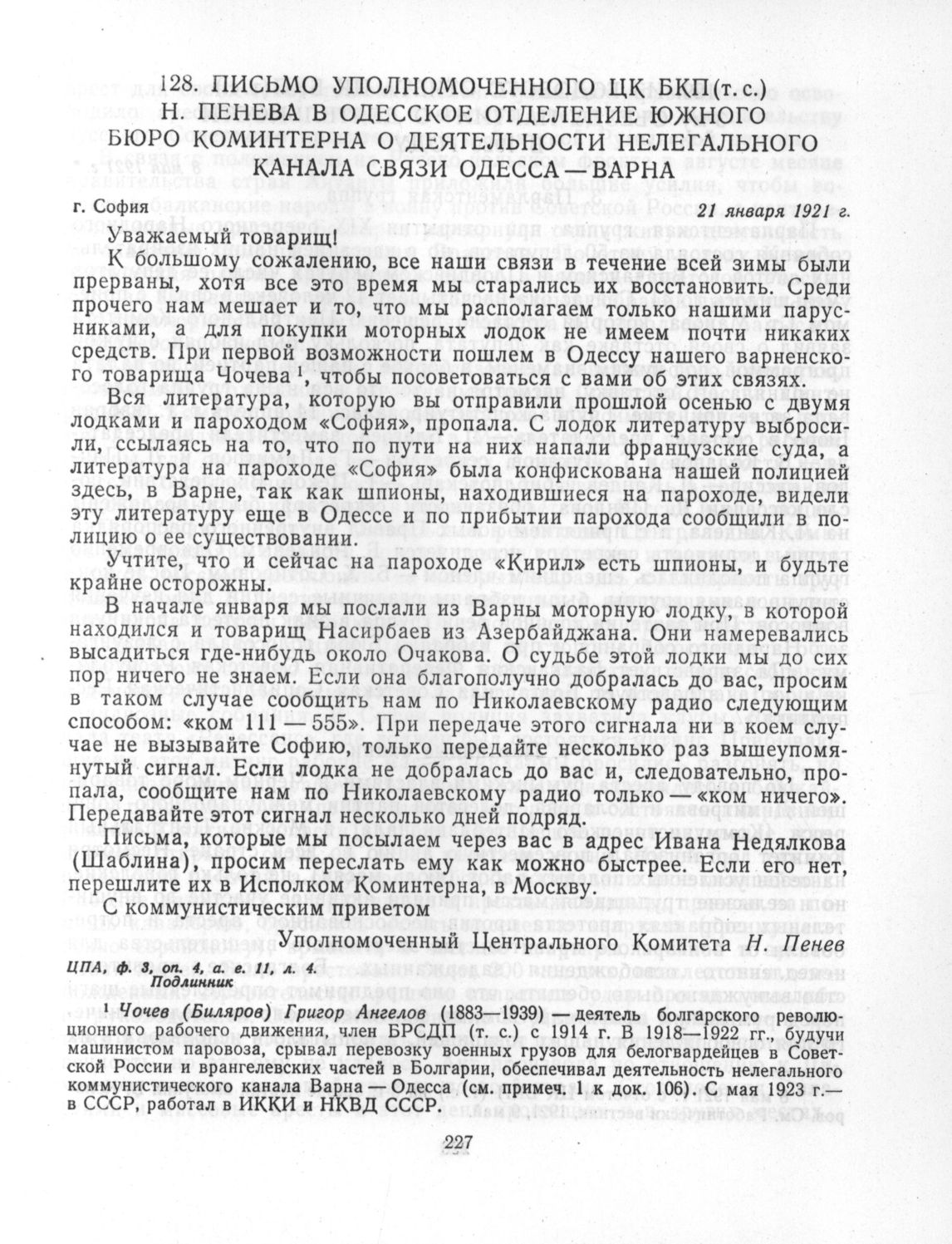 Письмо уполномоченного ЦК БКП (т. с.) Н. Пенева в Одесское отделение Южного бюро Коминтерна о деятельности нелегального канала связи Одесса - Варна. 21 января 1921 г. // ЦПА, ф. 3, оп. 4, а. е. 11, л. 4. Подлинник.