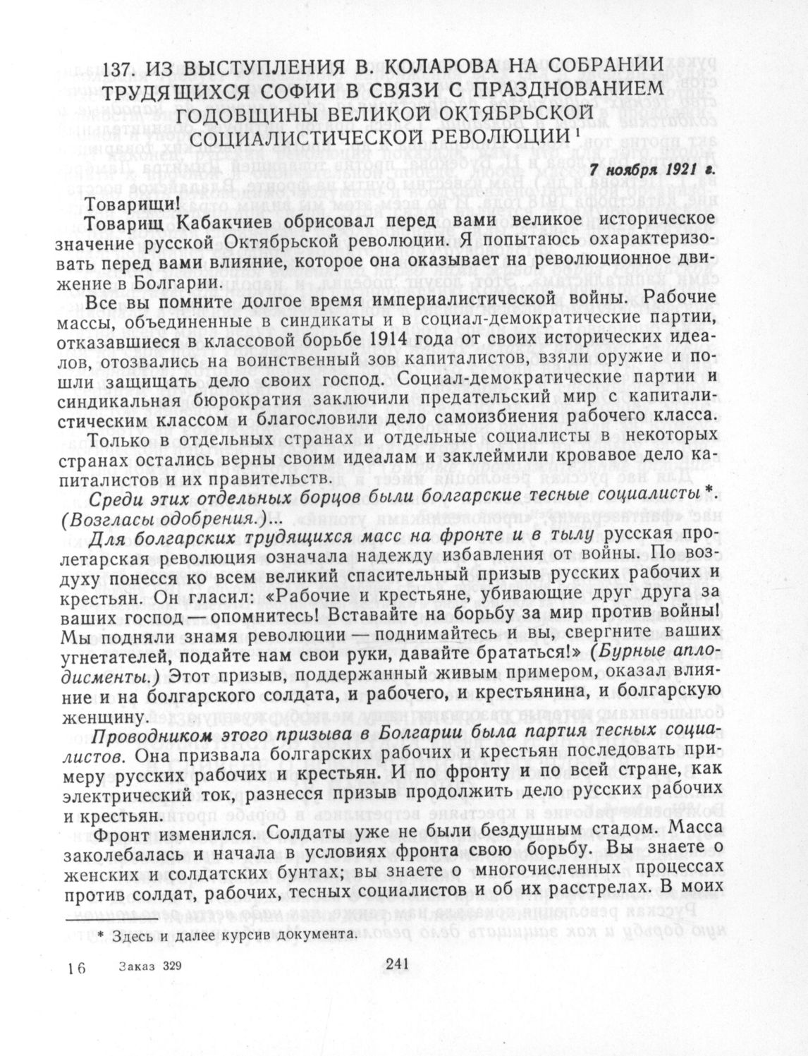 Из выступления В. Коларова на собрании трудящихся Софии в связи с празднованием годовщины Великой Октябрьской социалистической революции. 7 ноября 1921 г. // Коларов Басил. Избрани произведения, т. 1. с. 510-514.