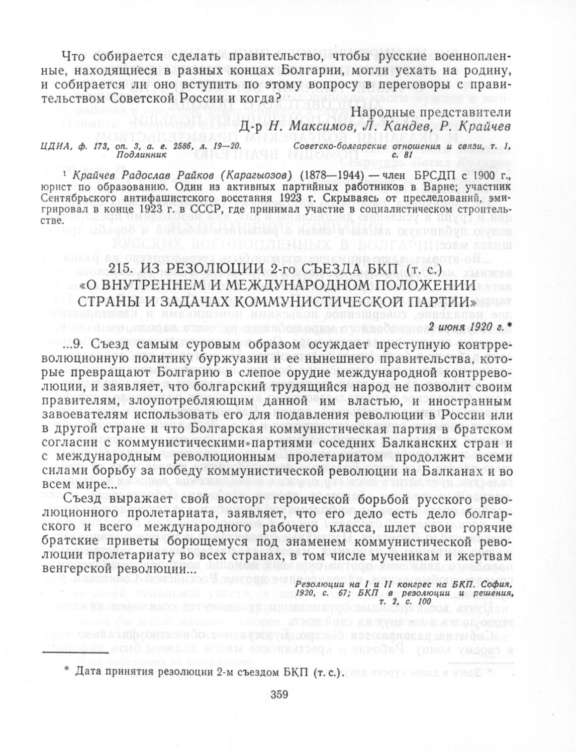 Из резолюции 2-го съезда БКП (т. с.) «О внутреннем и международном положении страны и задачах Коммунистической партии». 2 июня 1920 г. // Резолюции на I и II конгрес на БКП. София, 1920, с. 67; БКП в резолюции и решения, т. 2, с. 100.