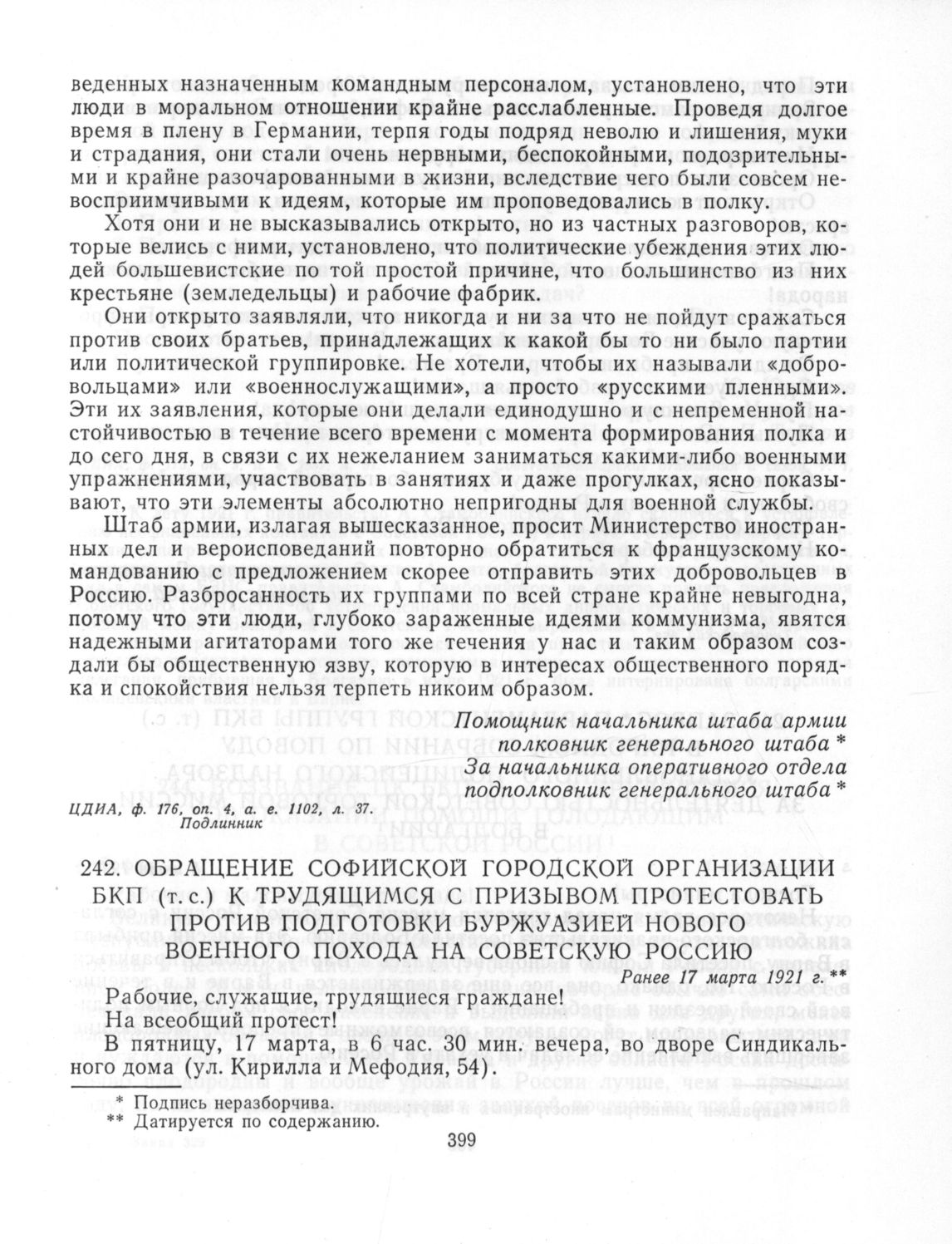 Обращение Софийской городской организации БКП (т. с.) к трудящимся с призывом протестовать против подготовки буржуазией нового военного похода на Советскую Россию. Ранее 17 марта 1921 г.