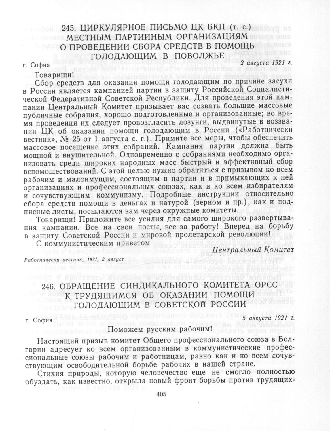 Обращение Синдикального комитета ОРСС к трудящимся об оказании помощи голодающим в Советской России. 5 августа 1921 г. // Работнически вестник, 1921, 5 август.