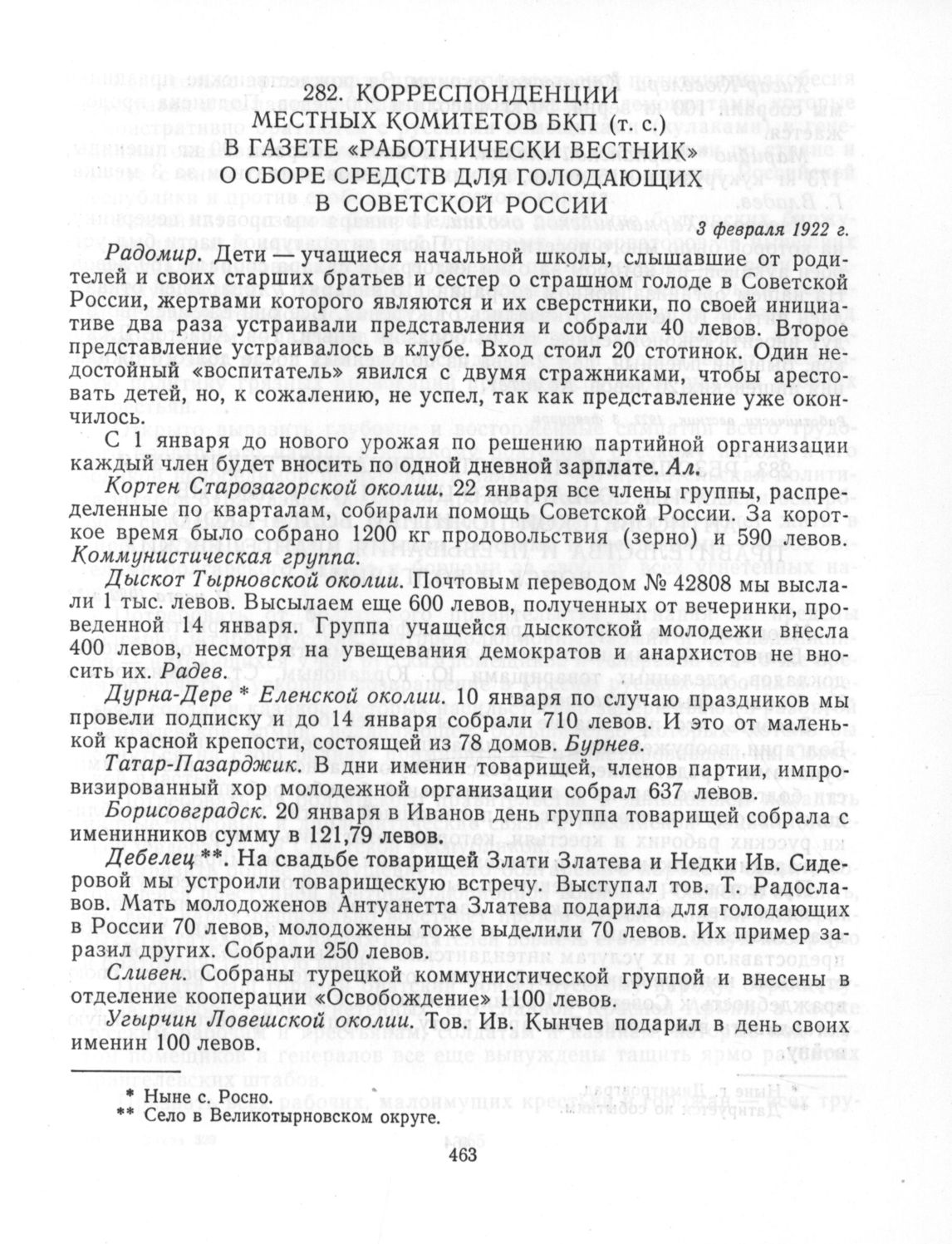 Корреспонденции местных комитетов БКП (т. с.) в газете «Работнически вестник» о сборе средств для голодающих в Советской России. 3 февраля 1922 г. // Работнически вестник, 1922, 3 февруари.