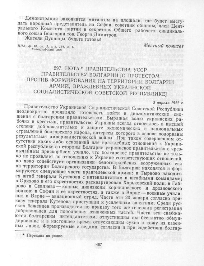 Нота правительства УССР правительству Болгарии [с протестом против формирования на территории Болгарии армий, враждебных Украинской Социалистической Советской Республике]. 3 апреля 1922 г. // Документы внешней политики СССР, т. V. М., 1961, с. 179-180.