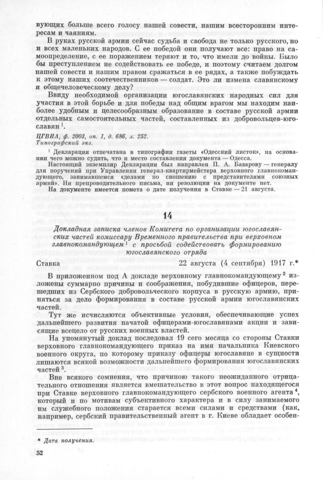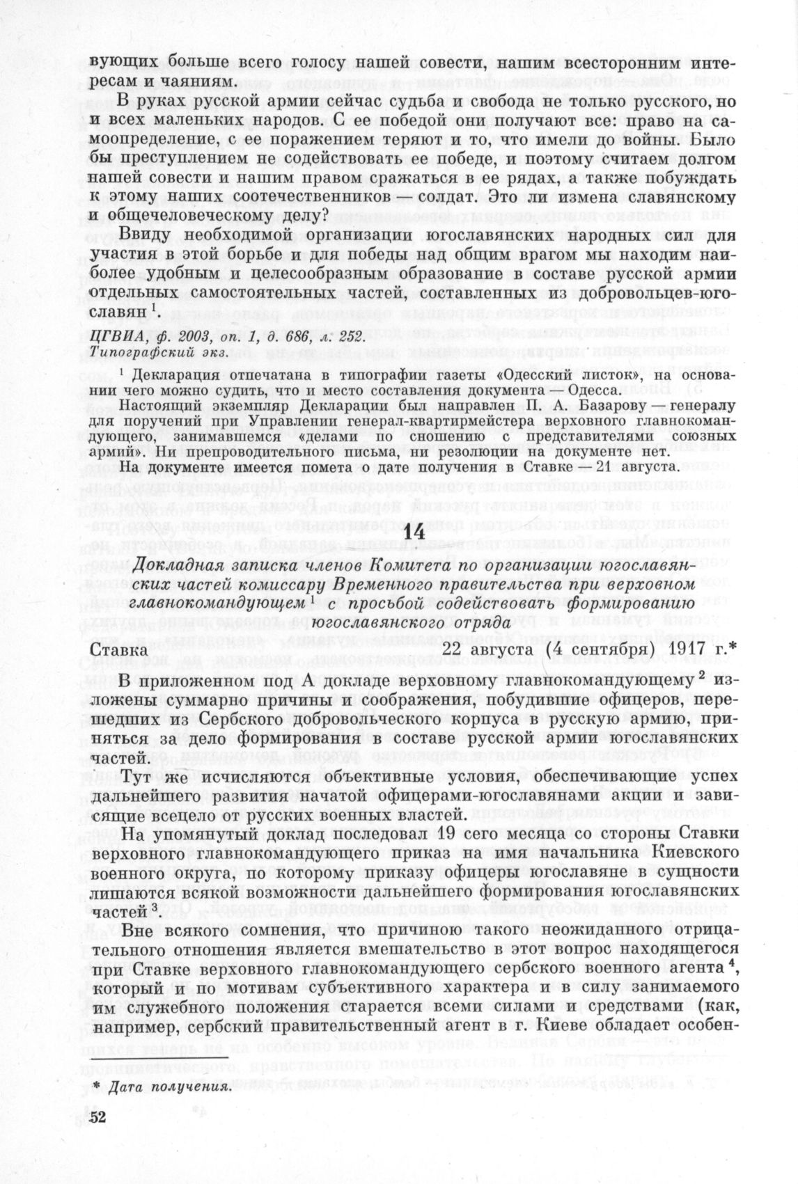 Докладная записка членов Комитета по организации югославянских частей комиссару Временного правительства при верховном главнокомандующем с просьбой содействовать формированию югославянского отряда. 22 августа (4 сентября) 1917 г. // ЦГВИА, ф. 2003, оп. 1, д. 686, лл. 283 и об. Подлинник.