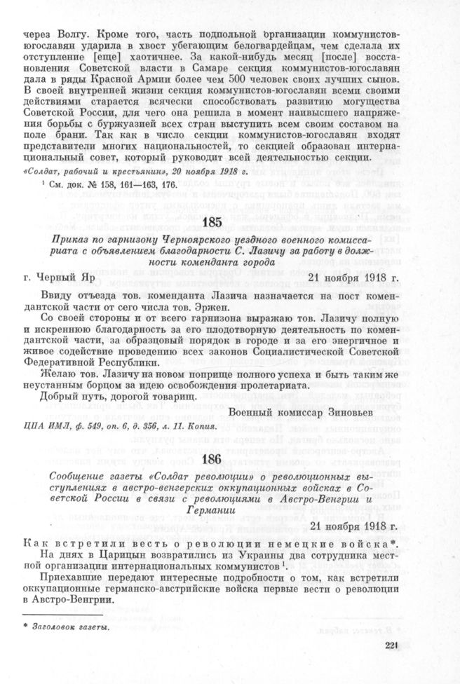 Сообщение газеты «Солдат революции» о революционных выступлениях в австро-венгерских оккупационных войсках в Советской России в связи с революциями в Австро-Венгрии и Германии. 21 ноября 1918 г. // «Солдат революции», 21 ноября 1918 г.
