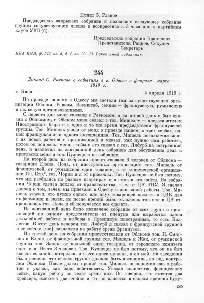 Доклад С. Раткова о событиях в г. Одессе в феврале—марте 1919 г. г. Киев, 4 апреля 1919 г. // ЦПА ИМЛ, ф. 549, оп. 6, д. 4, лл. 78—85. Подлинник.