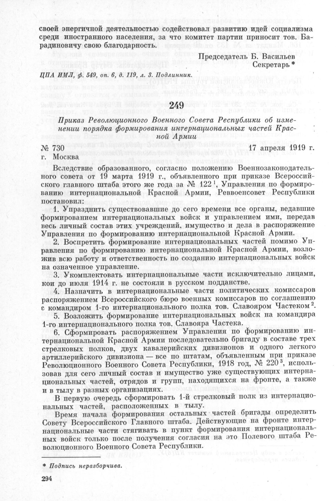 Приказ Революционного Военного Совета Республики об изменении порядка формирования интернациональных частей Красной Армии. 17 апреля 1919 г., г. Москва // Публ. по сб. «Боевое содружество...», М., 1957, стр. 176—177.