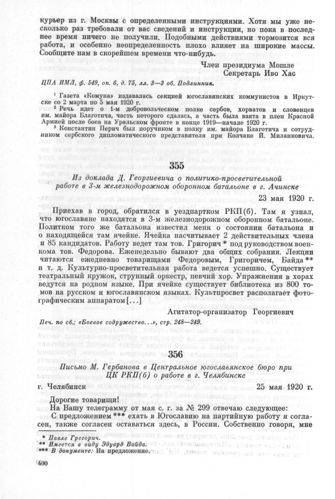 Из доклада Д. Георгиевича о политико-просветительной работе в 3-м железнодорожном оборонном батальоне в г. Ачинске. 23 мая 1920 г. // Печ. по сб.: «Боевое содружество...», стр. 248—249.