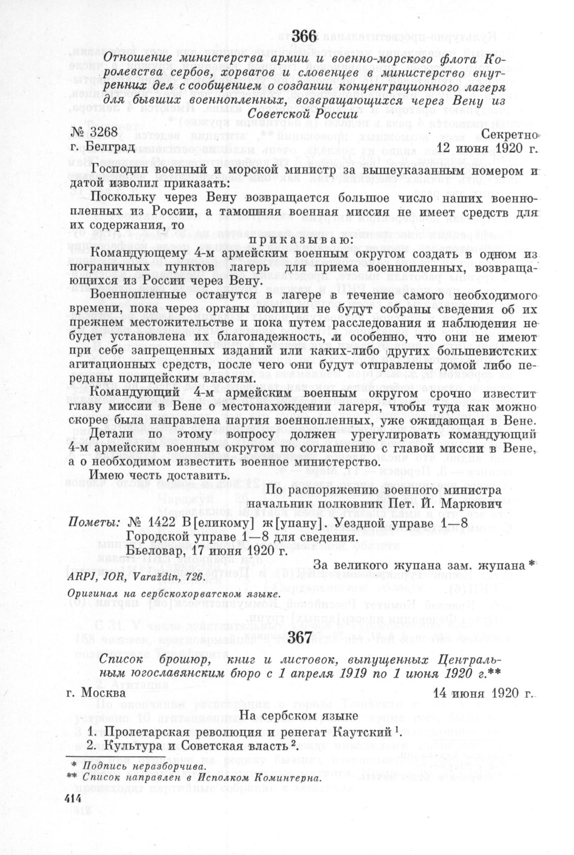 Список брошюр, книг и листовок, выпущенных Центральным югославянским бюро с 1 апреля 1919 по 1 июня 1920 г. г. Москва, 14 июня 1920 г. // ЦПА ИМЛ, ф. 549, оп. 6, д. 37, л. 8. Копия.