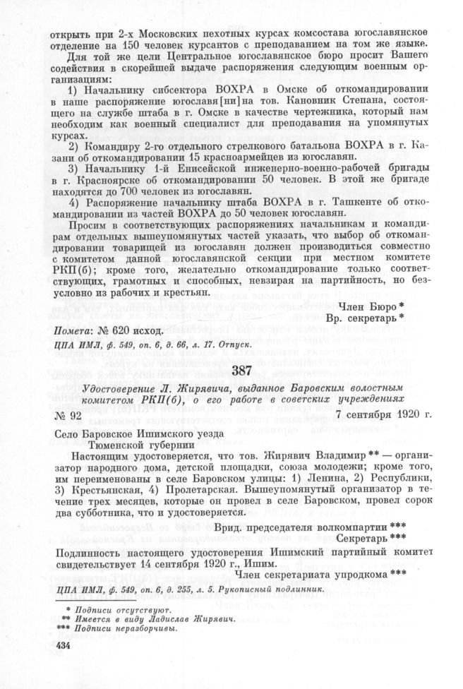 Удостоверение Л. Жирявича, выданное Баровским волостным комитетом РКП(б), о его работе в советских учреждениях. 7 сентября 1920 г. Село Баровское Ишимского уезда Тюменской губернии // ЦПА ИМЛ, ф. 549, оп. 6, д. 255, л. 5. Рукописный подлинник.
