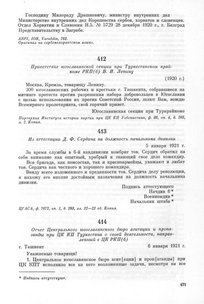 Отчет Центрального югославянского бюро агитации и пропаганды при ЦК КП Туркестана о своей деятельности, направленный в ЦК РКП(б). г. Ташкент, 6 января 1921 г. // ЦПА ИМЛ, ф. 549, оп. 6, д. 81, лл. 36—37. Подлинник.