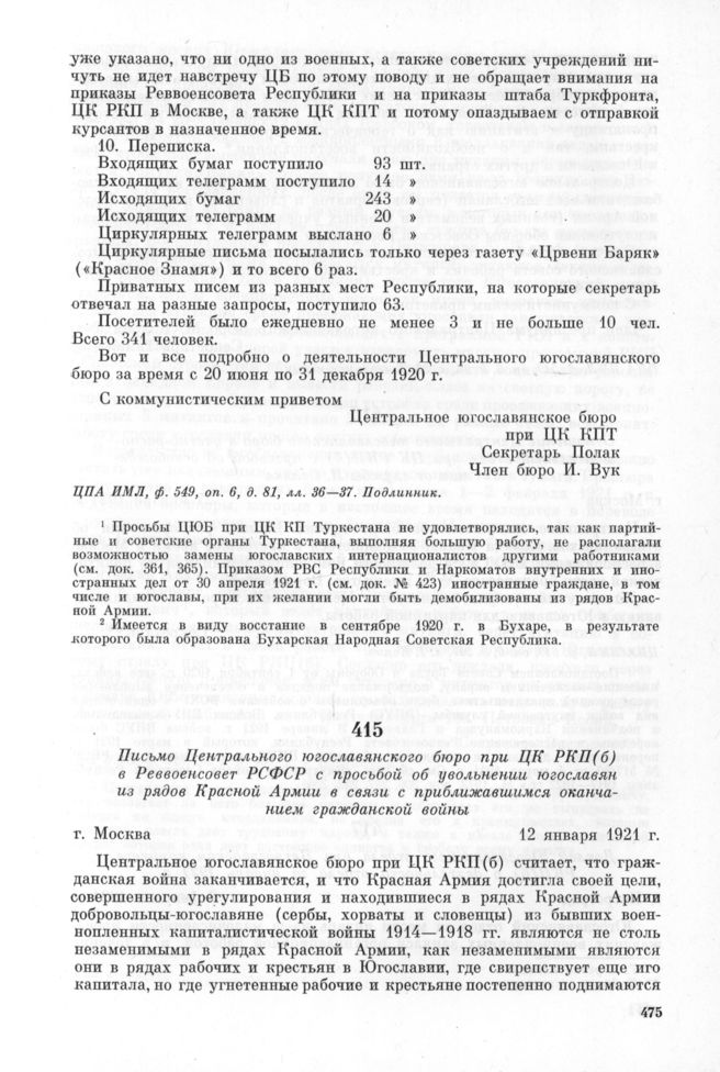 Письмо Центрального югославянского бюро при ЦК РКП(б) в Реввоенсовет РСФСР с просьбой об увольнении югославян из рядов Красной Армии в связи с приближавшимся оканчанием гражданской войны. г. Москва, 12 января 1921 г. // ЦПА ИМЛ, ф. 549, оп. 6, д. 96, л. 23. Заверенная копия.
