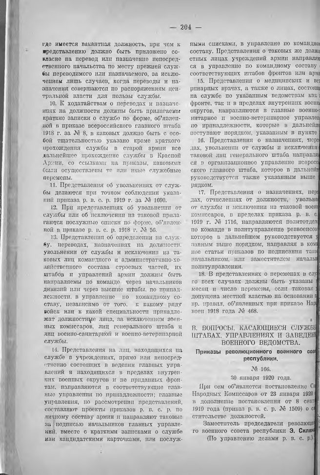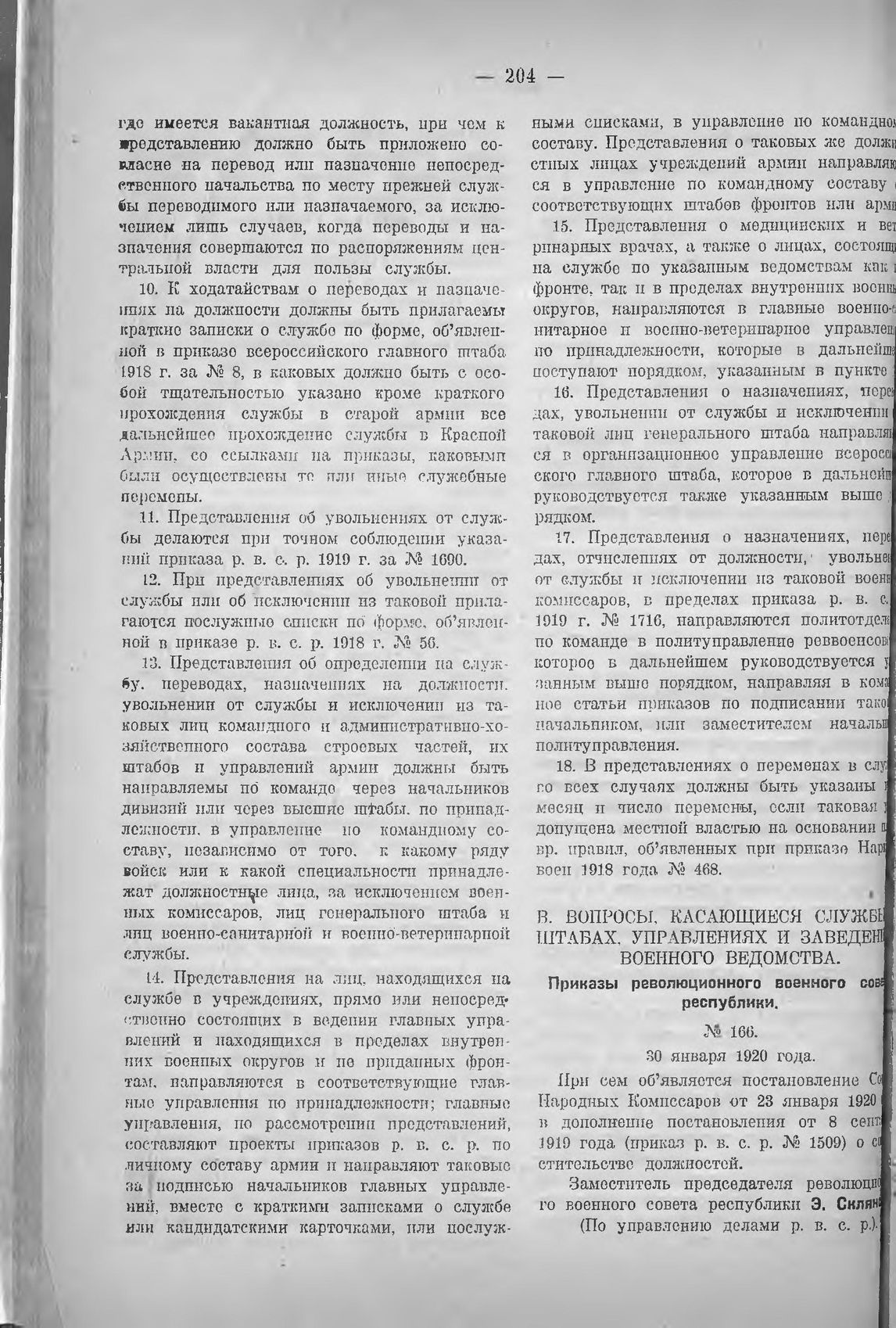 Приказ Революционного военного совета республики. (По управлению делами р. в. с. р.). № 166. 30 января 1920 года