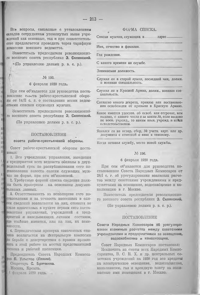 Приказ Революционного военного совета республики. (По управлению делами р. в. с. р.). № 196. 6 февраля 1920 года