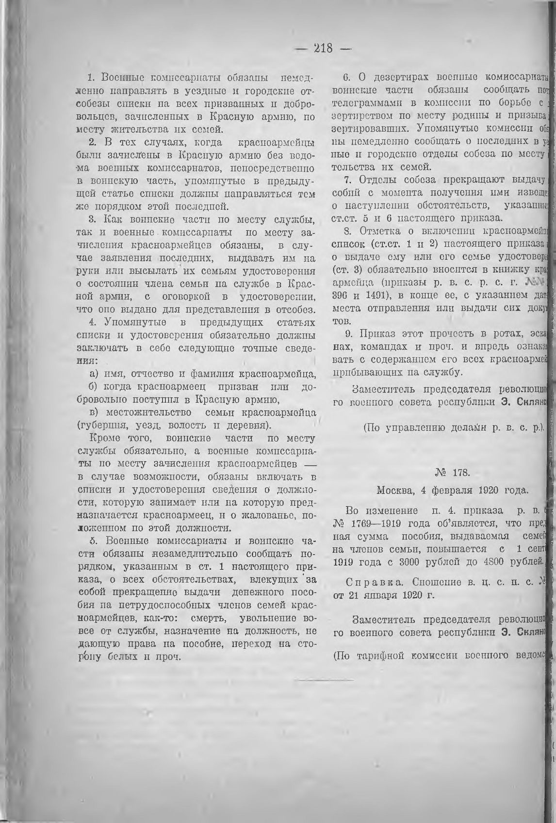 Приказ Революционного военного совета республики. (По тарифной комиссии военного ведомства). № 178. Москва, 4 февраля 1920 года