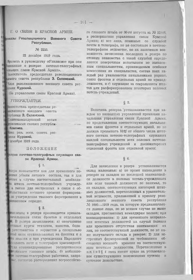 Приказ Революционного военного совета республики. (По управлению связи Красной Армии). № 2255. 22 декабря 1919 года