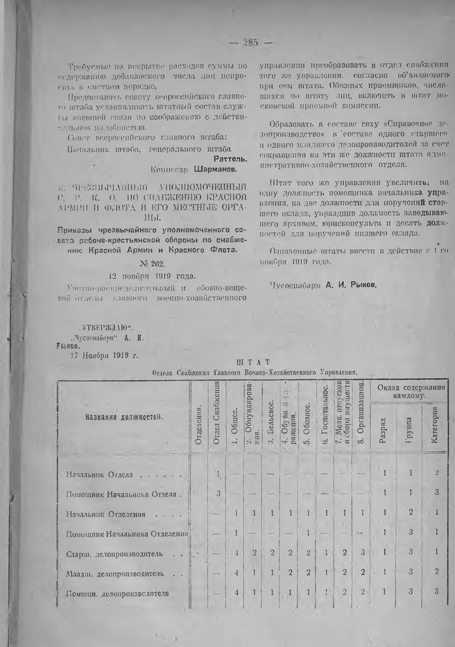 Приказ чрезвычайного уполномоченного совета рабоче-крестьянской обороны по снабжению Красной Армии и Красного Флота. № 262. 12 ноября 1919 года