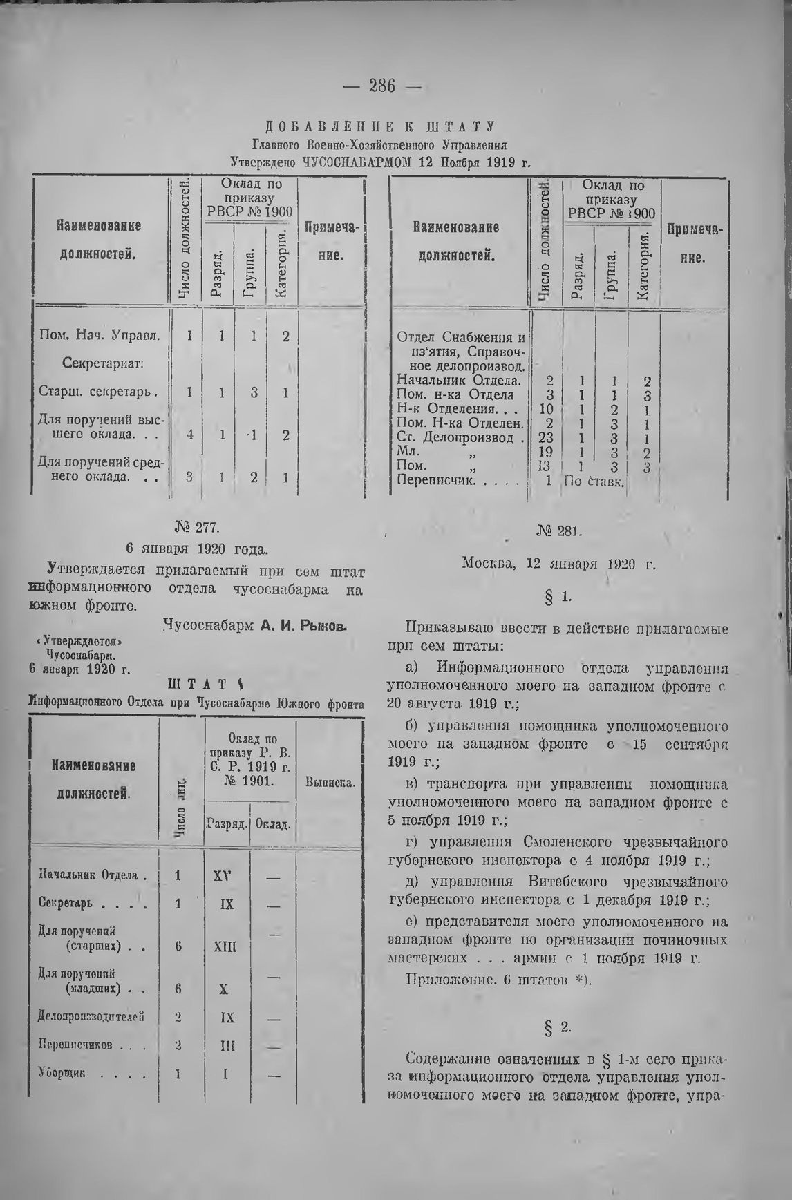 Приказ чрезвычайного уполномоченного совета рабоче-крестьянской обороны по снабжению Красной Армии и Красного Флота. № 281. Москва, 12 января 1920 г.
