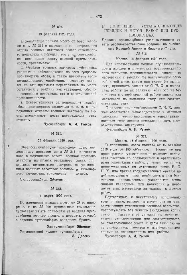 Приказ чрезвычайного уполномоченного совета рабоче-крестьянской обороны по снабжению Красной Армии и Красного Флота. № 316. Москва, 13 февраля 1920 года