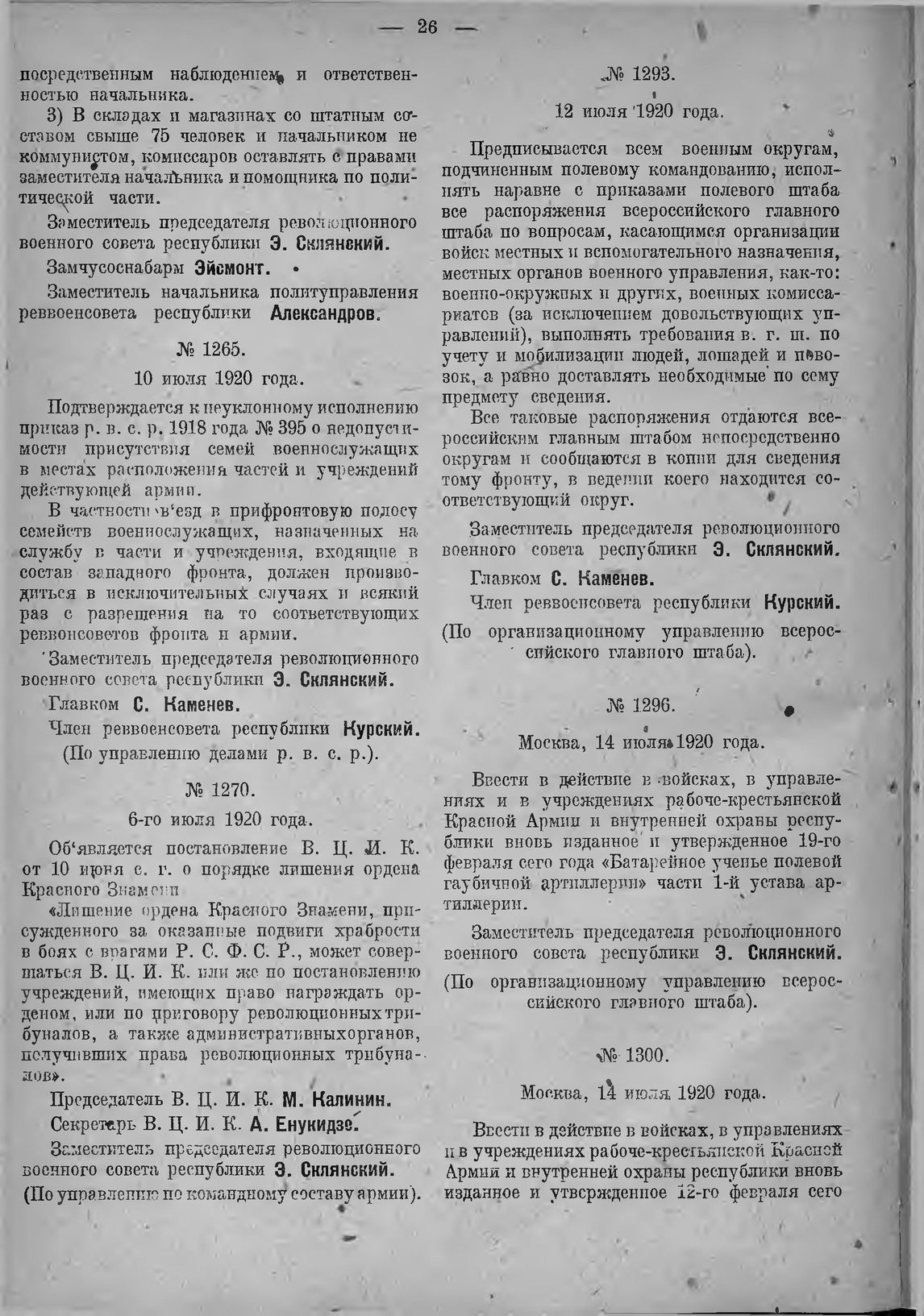 Приказ Революционного Военного Совета Республики (По управлению по командному составу армии) № 1270. 6-го июля 1920 года