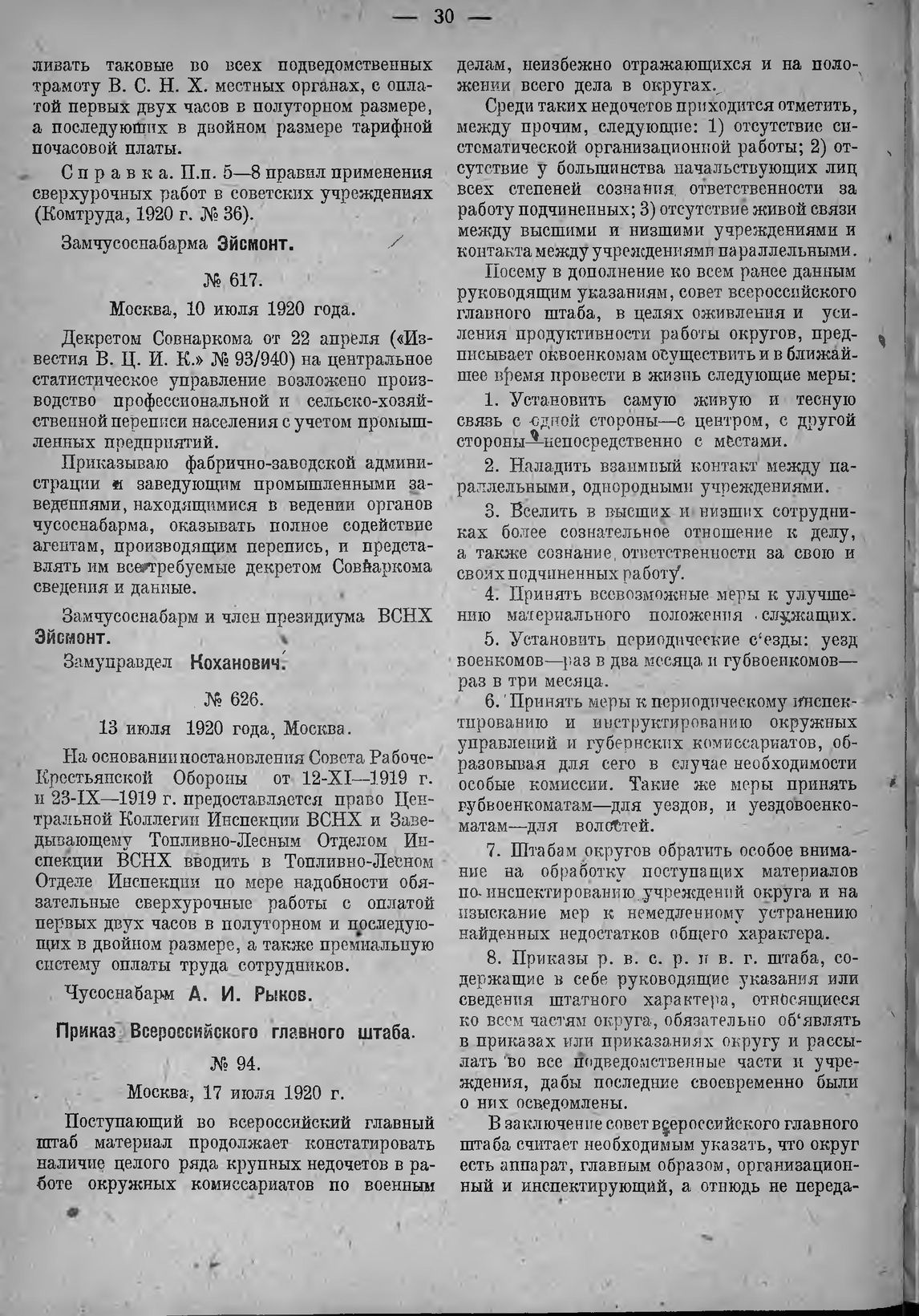 Приказ Чрезвычайного Уполномоченного Совета Рабоче-Крестьянской Обороны по снабжению Красной Армии и Красного Флота. № 617. Москва, 10 июля 1920 года