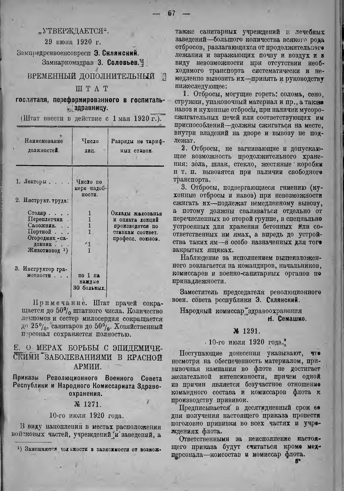 Приказ Революционного Военного Совета Республики и Народного Комиссариата здравоохранения. № 1271. 10-го июля 1920 года