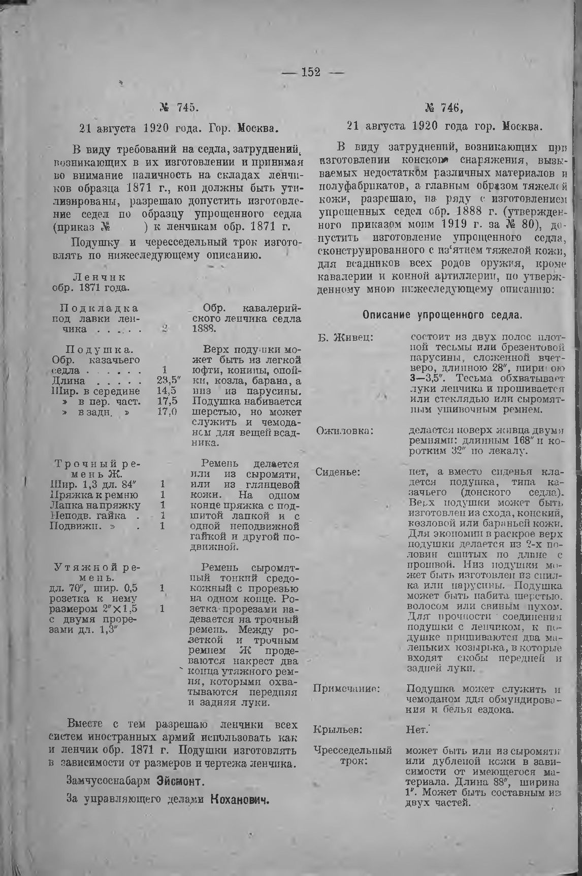 Приказ Чрезвычайного Уполномоченного Совета Рабоче-Крестьянской Обороны по Снабжению Красной Армии и Красного Флота. № 745. 21 августа 1920 года, гор. Москва