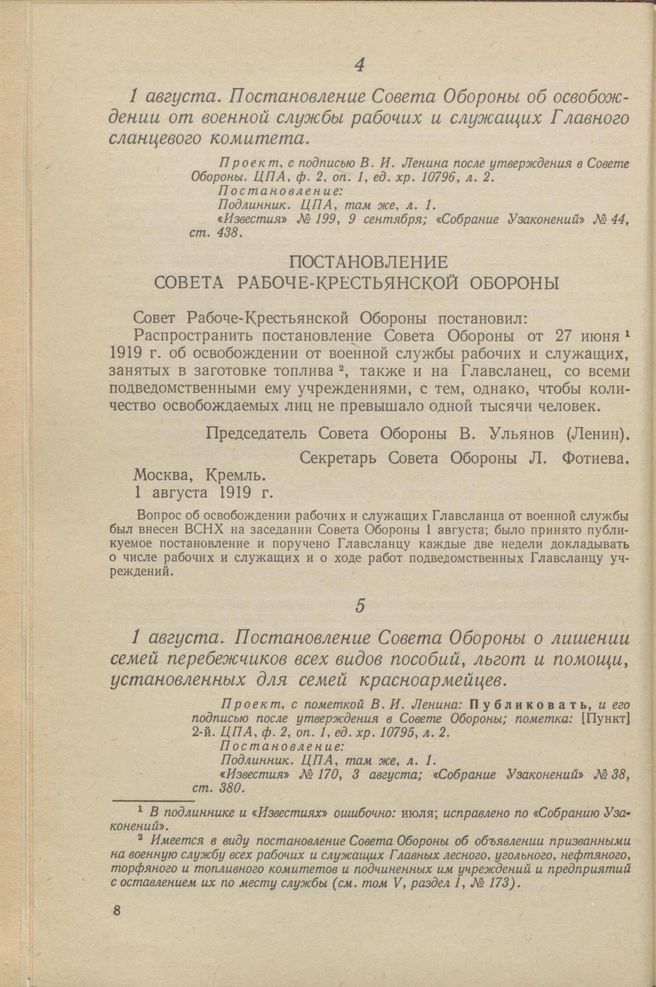 Главная Серия «Экономическая история. Документы, исследования, переводы» Декреты советской власти в 18 т. Декреты Советской власти. Т. VI. 1 августа – 9 декабря 1919 г. Документы 1 августа. Постановление Совета Обороны об освобождении от военной ...