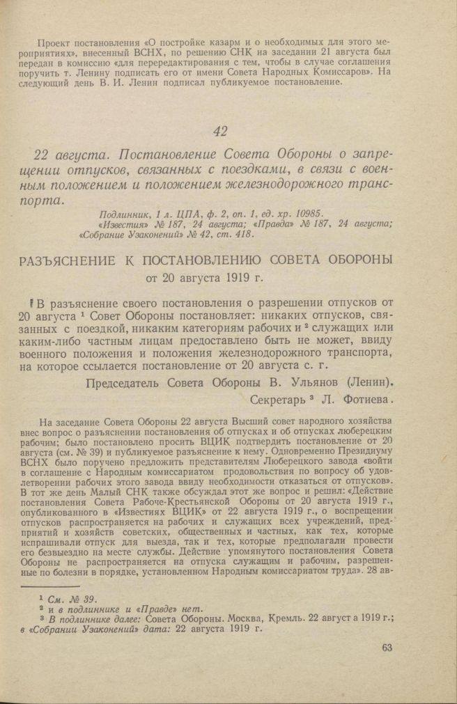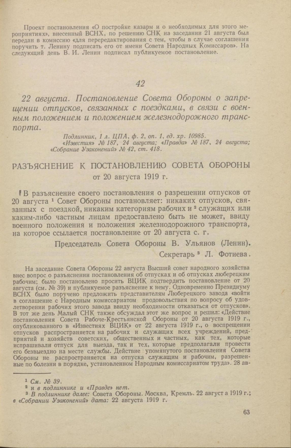 Главная Серия «Экономическая история. Документы, исследования, переводы» Декреты советской власти в 18 т. Декреты Советской власти. Т. VI. 1 августа – 9 декабря 1919 г. Документы 22 августа. Постановление Совета Обороны о запрещении отпусков, свя...