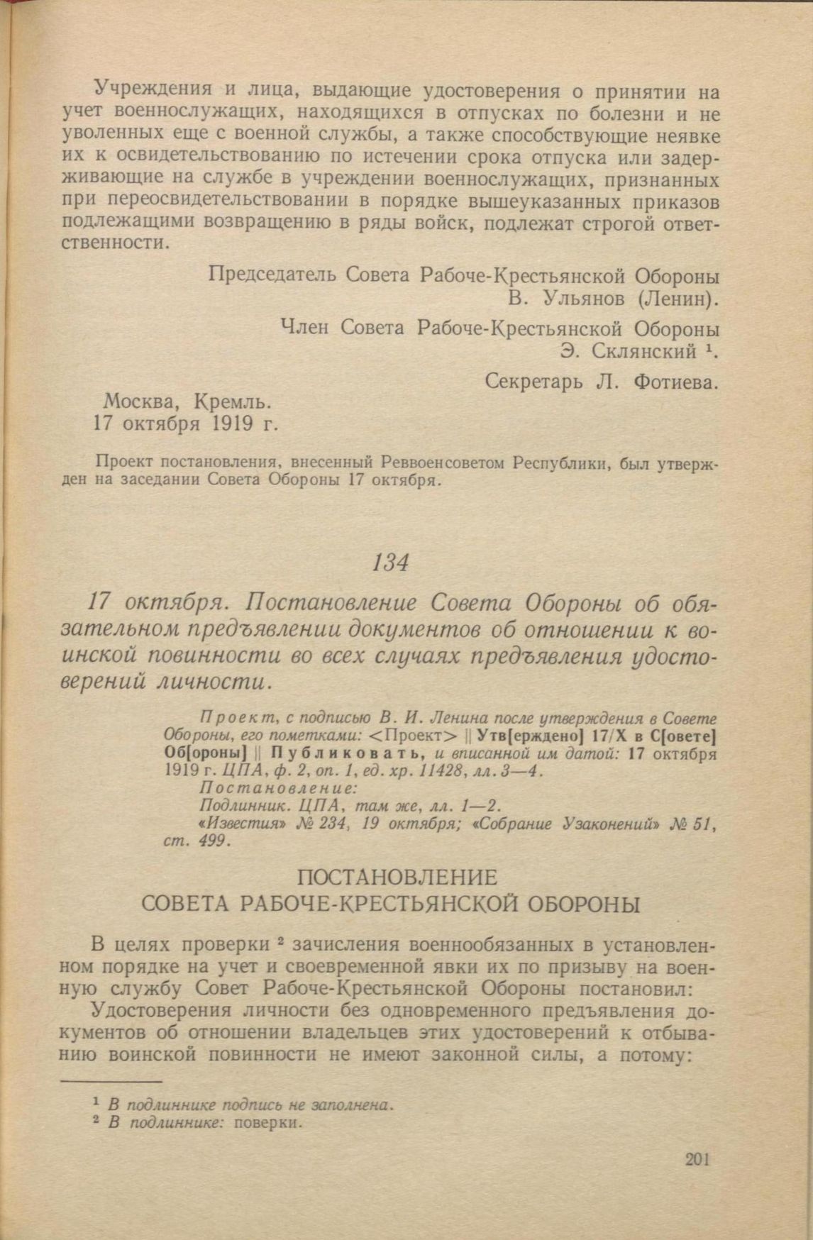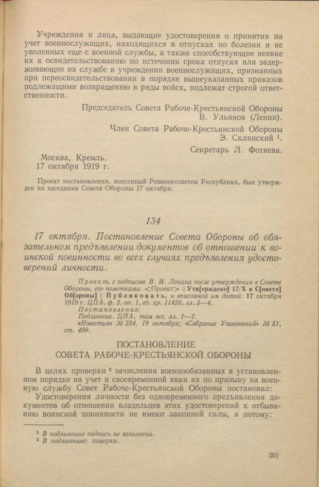 17 октября. Постановление Совета Обороны об обязательном предъявлении документов об отношении к воинской повинности во всех случаях предъявления удостоверений личности // Проект, с подписью В. И. Ленина после утверждения в Совете Обороны, его пометками: <Проект> || Утв[ерждено] 17/X в С[овете] Об[ороны] || Публиковать, и вписанной им датой: 17 октября 1919 г. ЦПА, ф. 2, оп. 1, ед. хр. 11428, лл. 3—4. Постановление: Подлинник. ЦПА, там же, лл. 1—2. «Известия» № 234, 19 октября; «Собрание Узаконений» № 51, ст. 499.