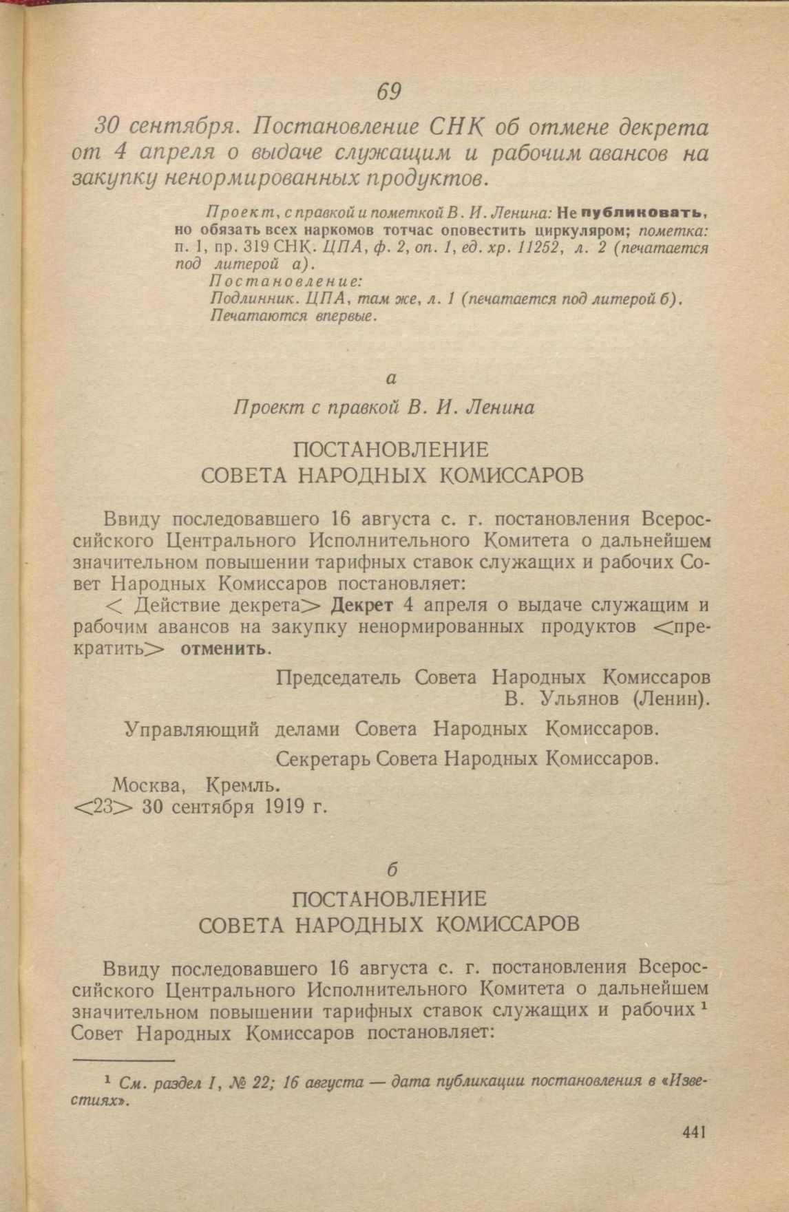 Главная Серия «Экономическая история. Документы, исследования, переводы» Декреты советской власти в 18 т. Декреты Советской власти. Т. VI. 1 августа – 9 декабря 1919 г. Документы 30 сентября. Постановление СНК об отмене декрета от 4 апреля о выда...