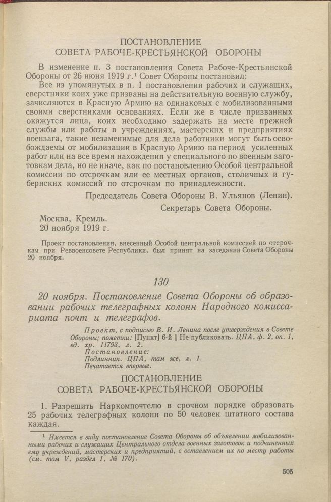 Главная Серия «Экономическая история. Документы, исследования, переводы» Декреты советской власти в 18 т. Декреты Советской власти. Т. VI. 1 августа – 9 декабря 1919 г. Документы 20 ноября. Постановление Совета Обороны об образовании рабочих теле...