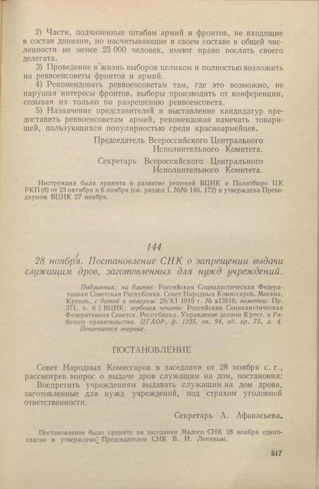 28 ноября. Постановление СНК о запрещении выдачи служащим дров, заготовленных для нужд учреждений // Подлинник; на бланке: Российская Социалистическая Федеративная Советская Республика. Совет Народных Комиссаров. Москва, Кремль, с датой и номером: 29/XI 1919 г. № а13516; пометки: Пр. 371, п. 6 || ВЦИК; гербовая печать: Российская Социалистическая Федеративная Советск. Республика. Управление делами Крест. и Рабочего правительства. ЦГАОР, ф. 1235, оп. 94, ед. хр. 75, л. 4. Печатается впервые.
