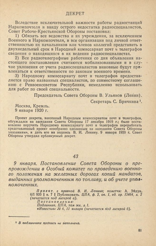Главная Серия «Экономическая история. Документы, исследования, переводы» Декреты советской власти в 18 т. Декреты Советской власти. Т. VII. 10 декабря 1919 г. – 31 марта 192... Документы 9 января. Постановление Совета Обороны о препровождении в Особый ко...