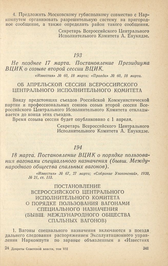 Главная Серия «Экономическая история. Документы, исследования, переводы» Декреты советской власти в 18 т. Декреты Советской власти. Т. VII. 10 декабря 1919 г. – 31 марта 192... Документы 18 марта. Постановление ВЦИК о порядке пользования вагонами специал...