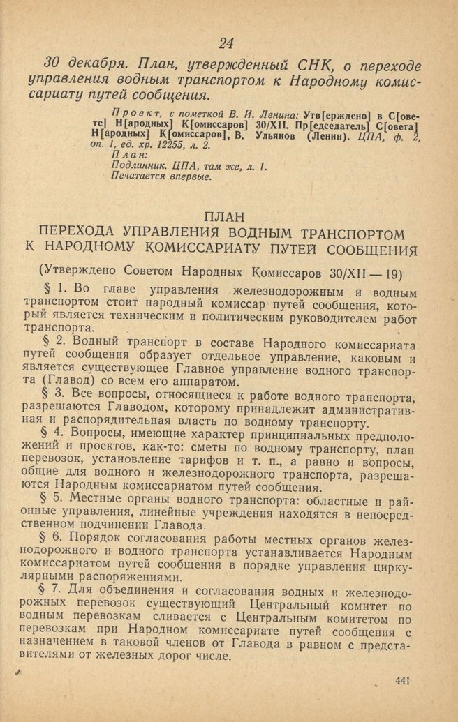 Главная Серия «Экономическая история. Документы, исследования, переводы» Декреты советской власти в 18 т. Декреты Советской власти. Т. VII. 10 декабря 1919 г. – 31 марта 192... Документы 30 декабря. План, утвержденный СНК, о переходе управления водным тр...