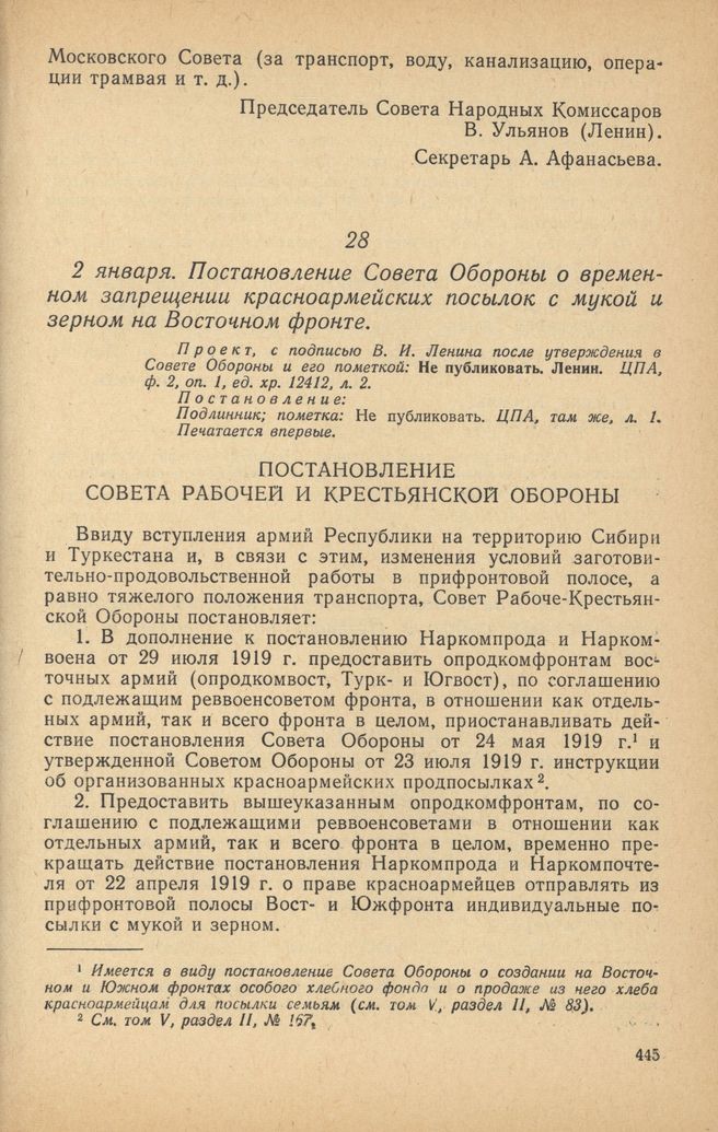 Главная Серия «Экономическая история. Документы, исследования, переводы» Декреты советской власти в 18 т. Декреты Советской власти. Т. VII. 10 декабря 1919 г. – 31 марта 192... Документы 2 января. Постановление Совета Обороны о временном запрещении красн...